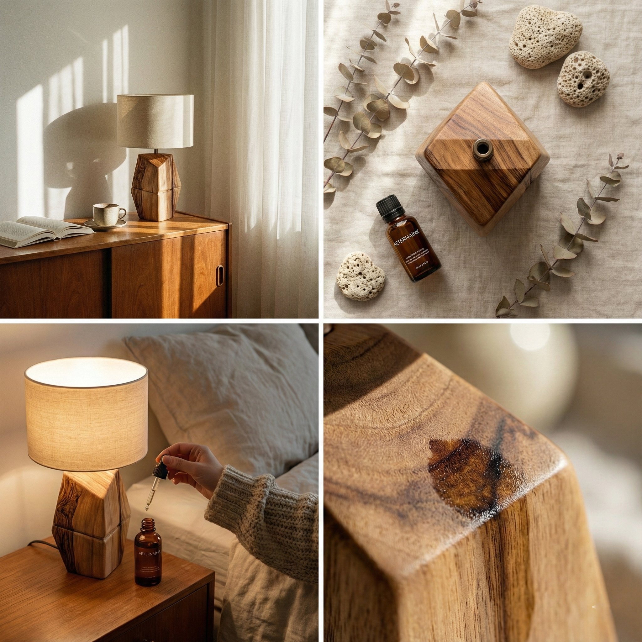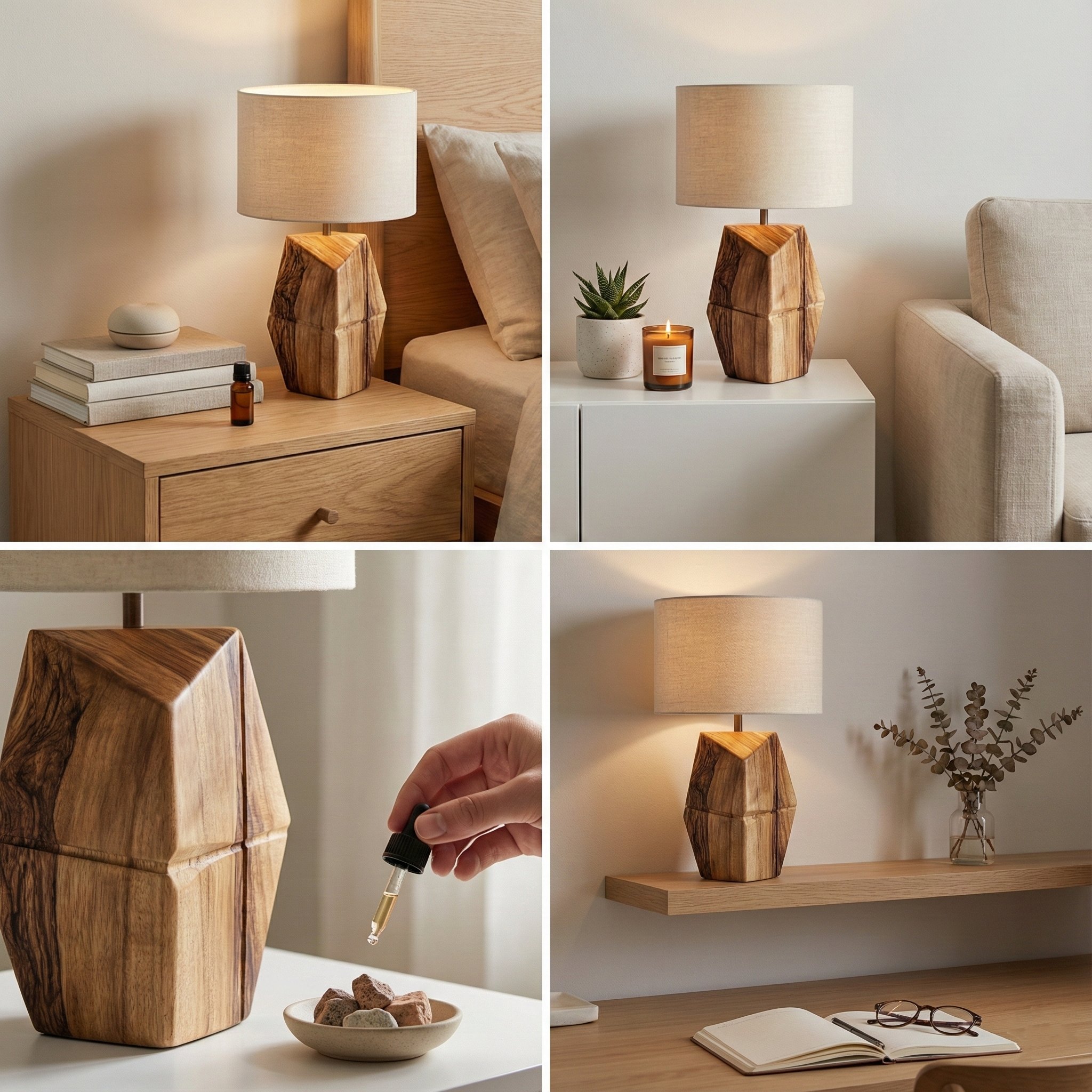 Handcrafted Geometric Solid Walnut Wood Aromatherapy Table Lamp with Dimmable Warm Light and Linen Shade for Zen Bedroom Nightstand Decor
