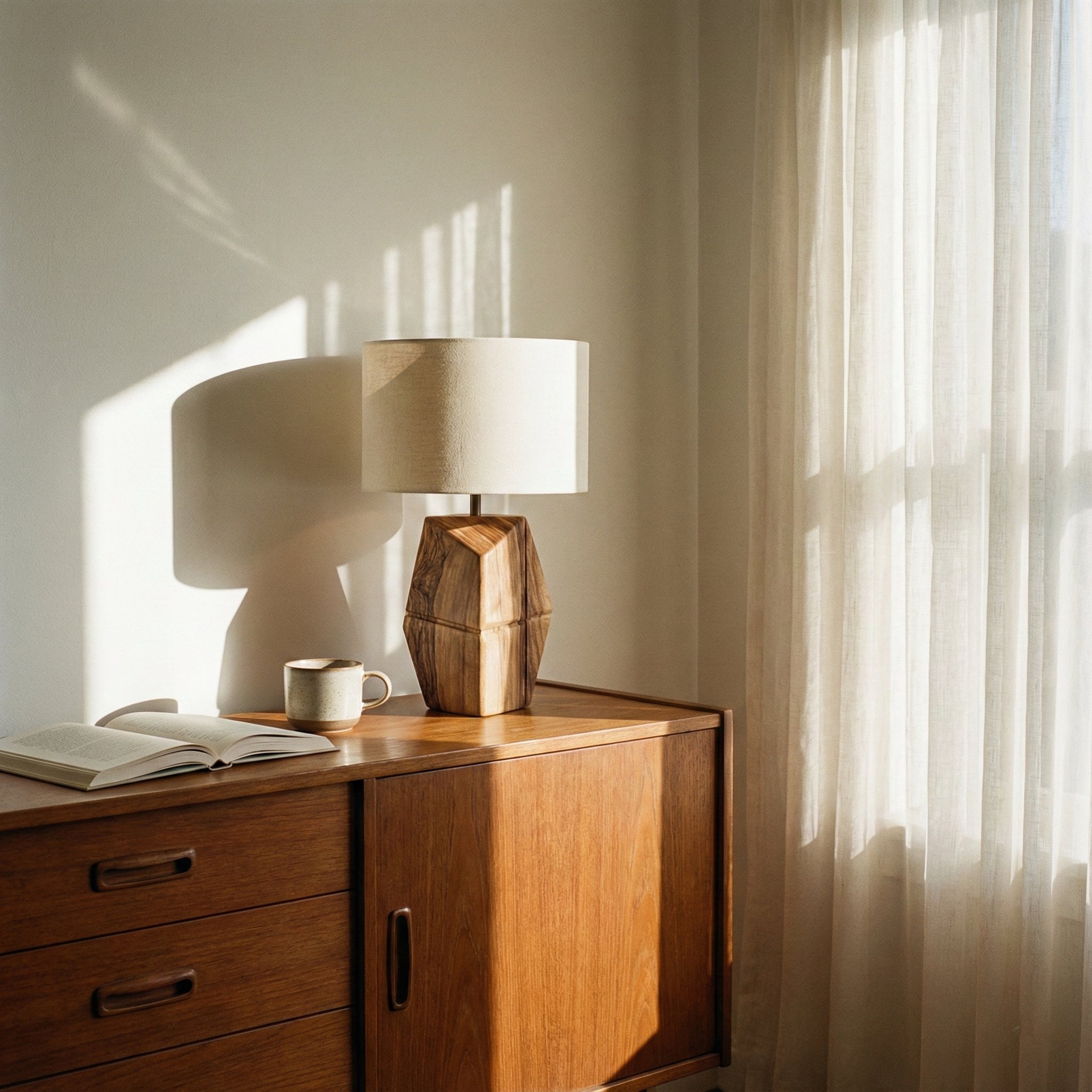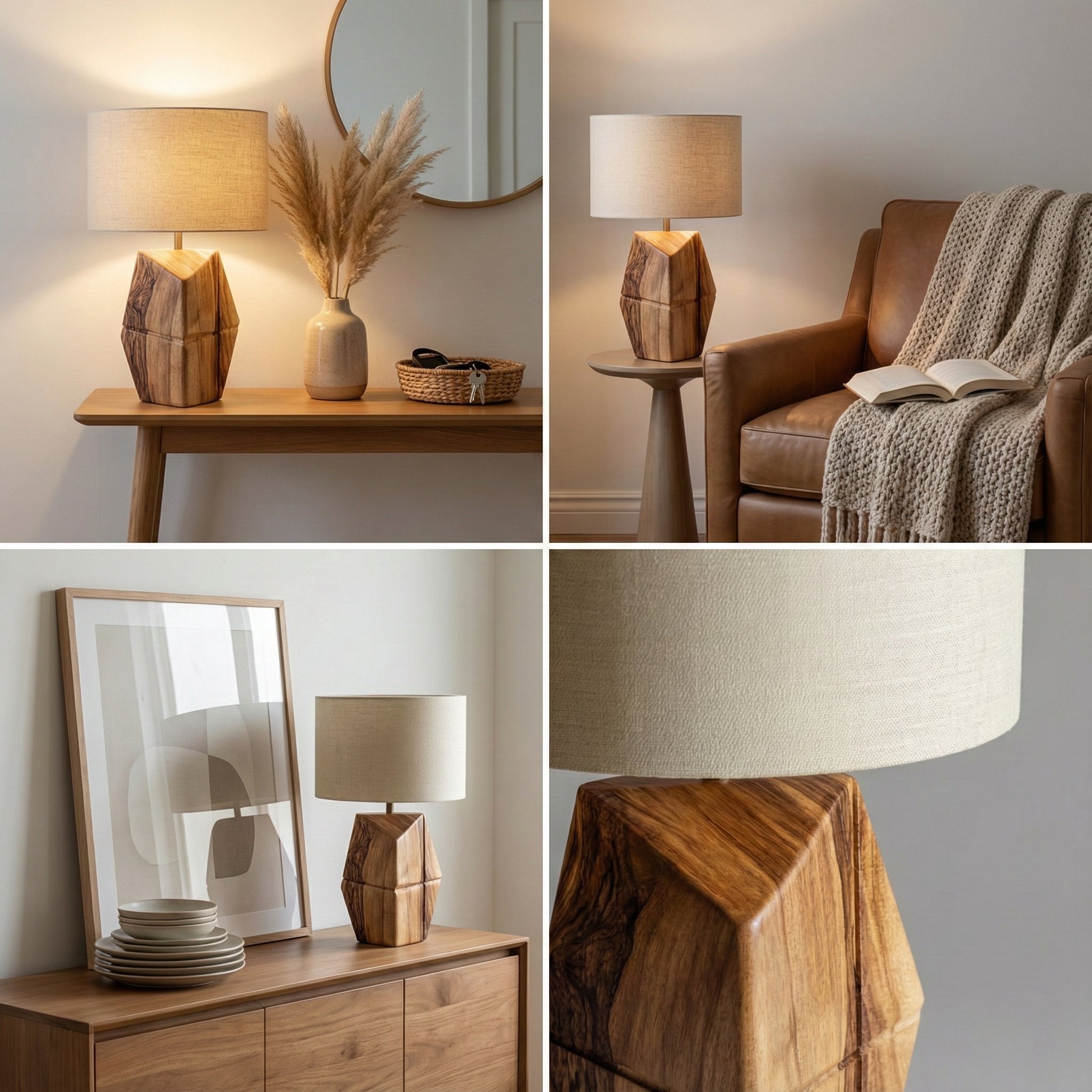The Facet | Hand-Carved Geometric Solid Wood Lamp with Linen Shade - Dimmable Artisan Decor for Modern Nordic Bedroom Nightstand Decor