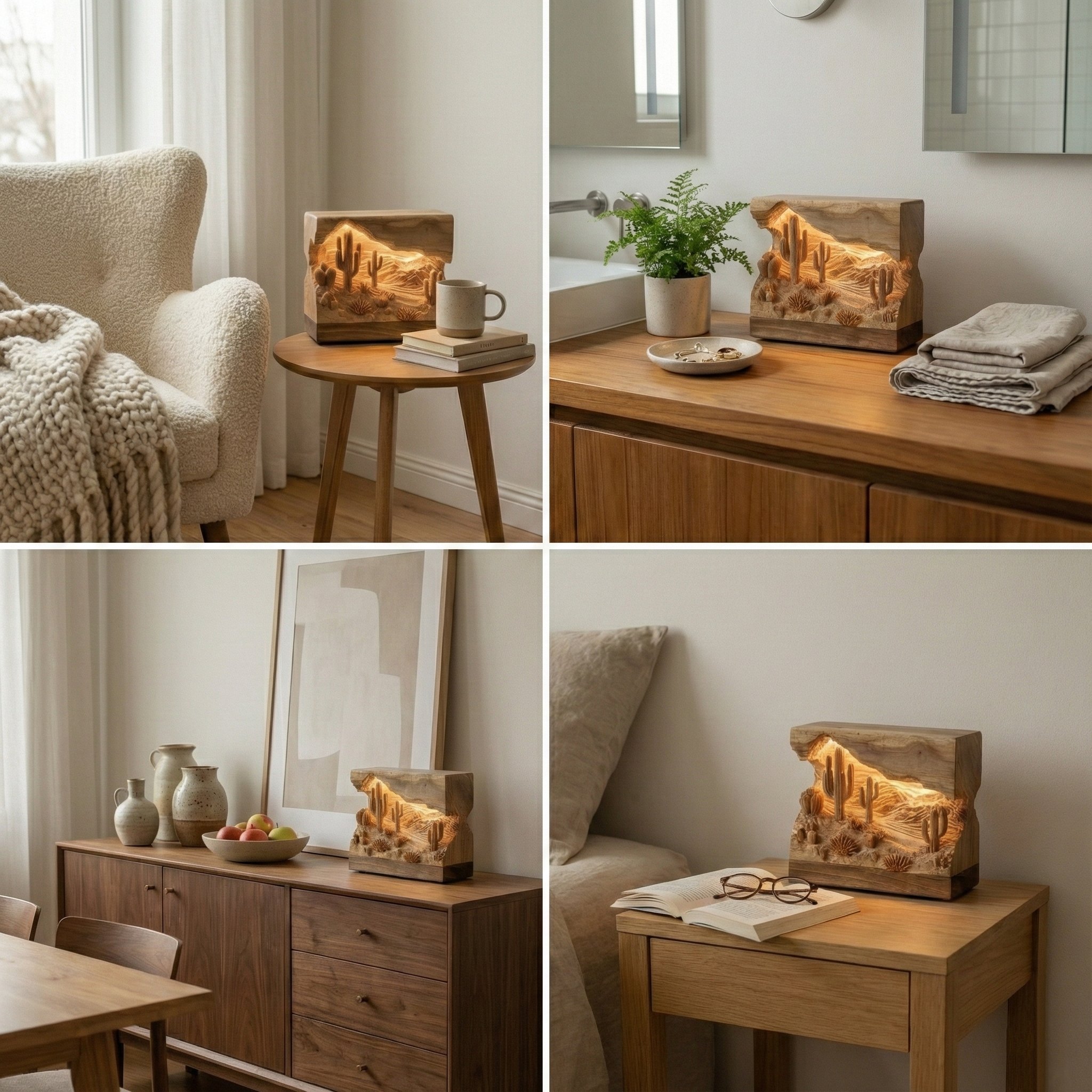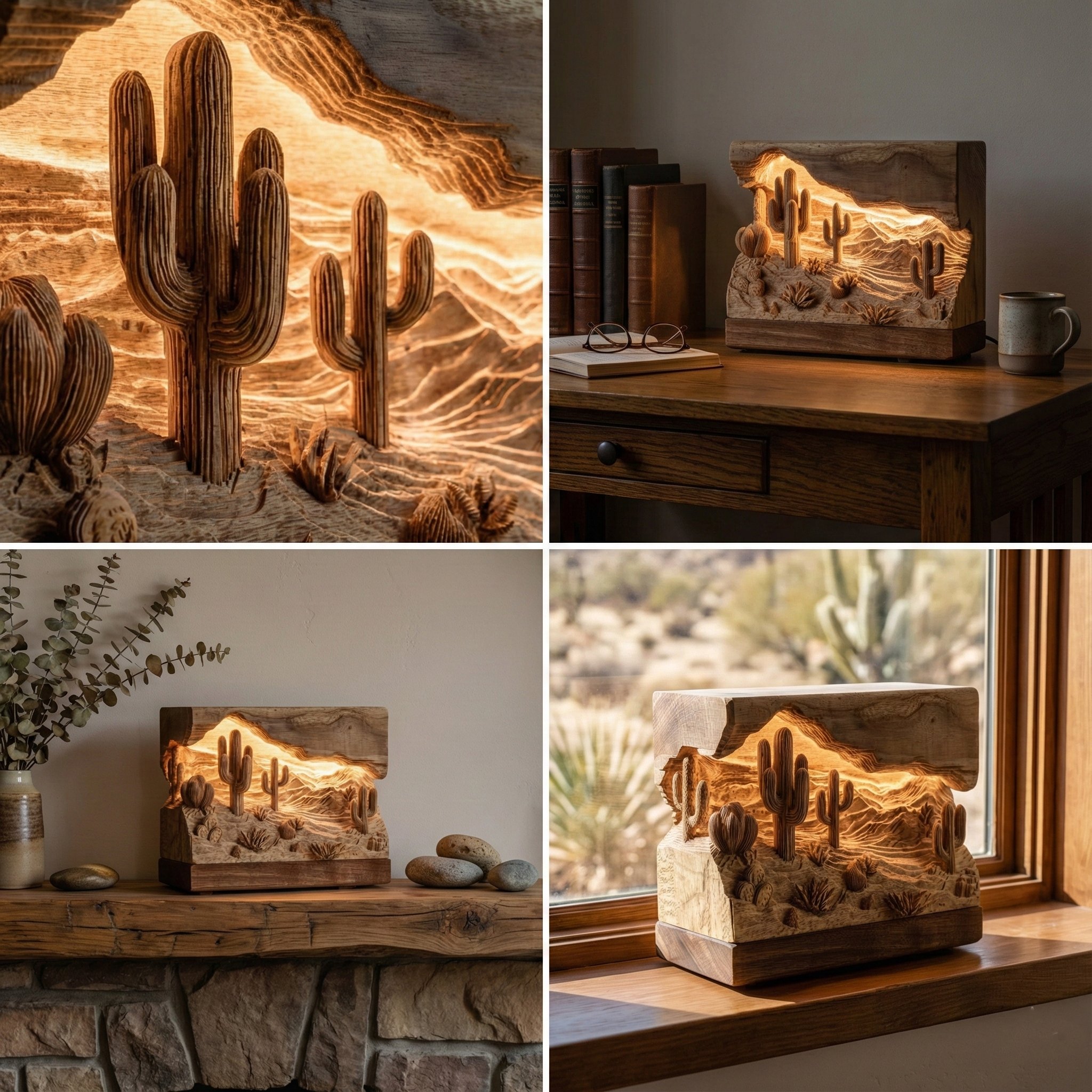 When illuminated, the hidden LED core transforms the wood into a glowing spectacle. The light filters through the carved layers, recreating the golden hour of a desert sunset. The shadows cast by the cacti become longer and softer, providing a cozy, amber ambiance that instantly warms up any room.