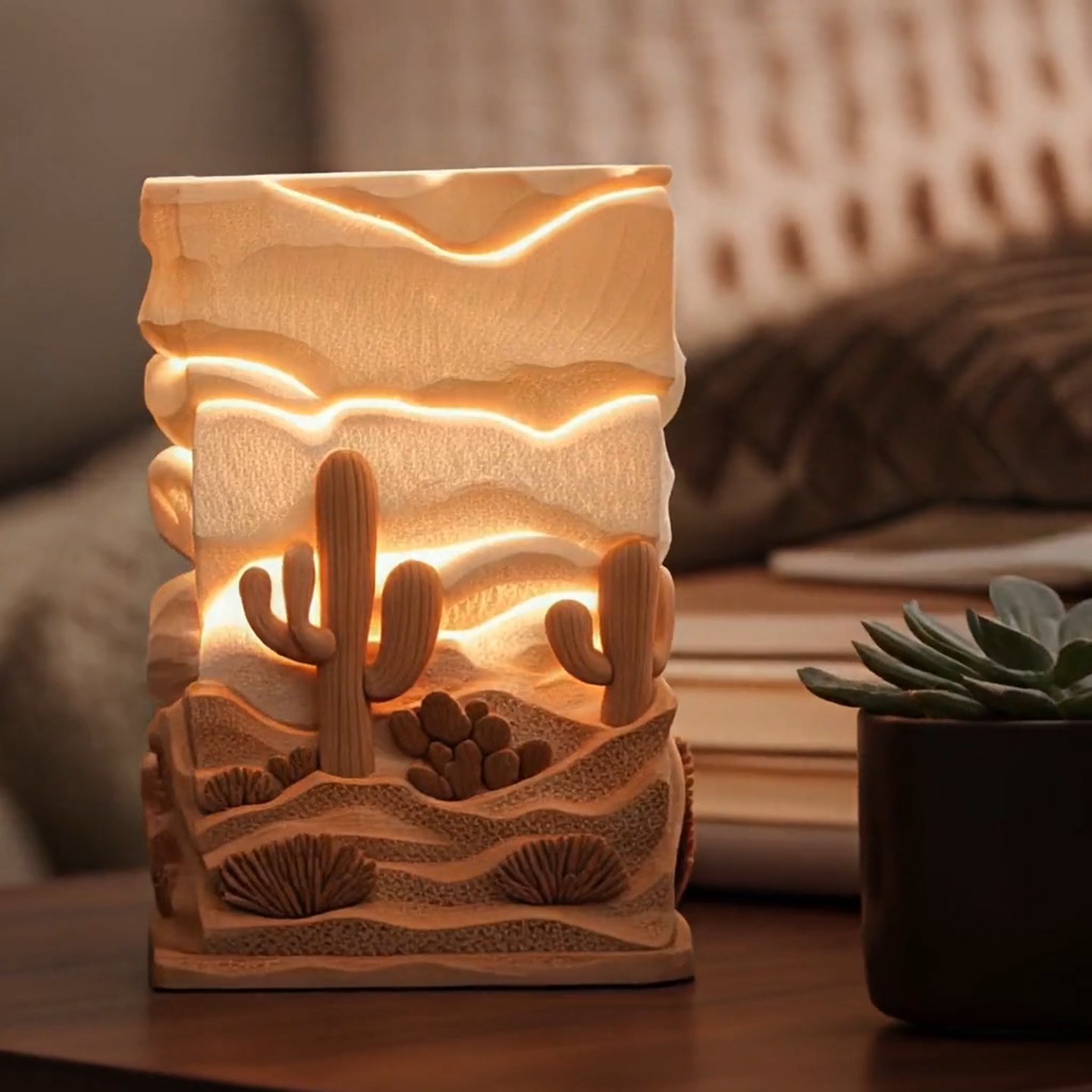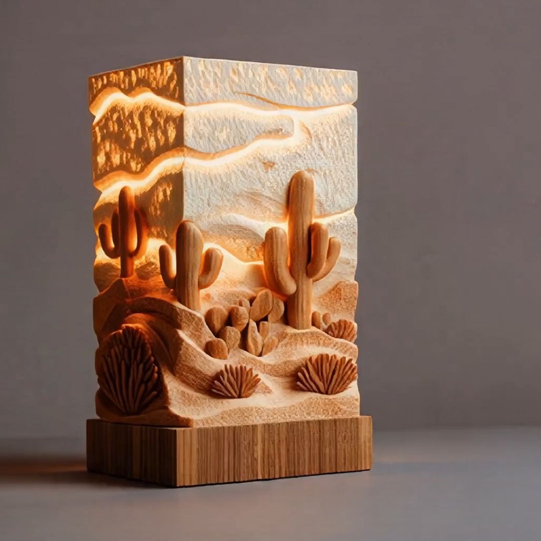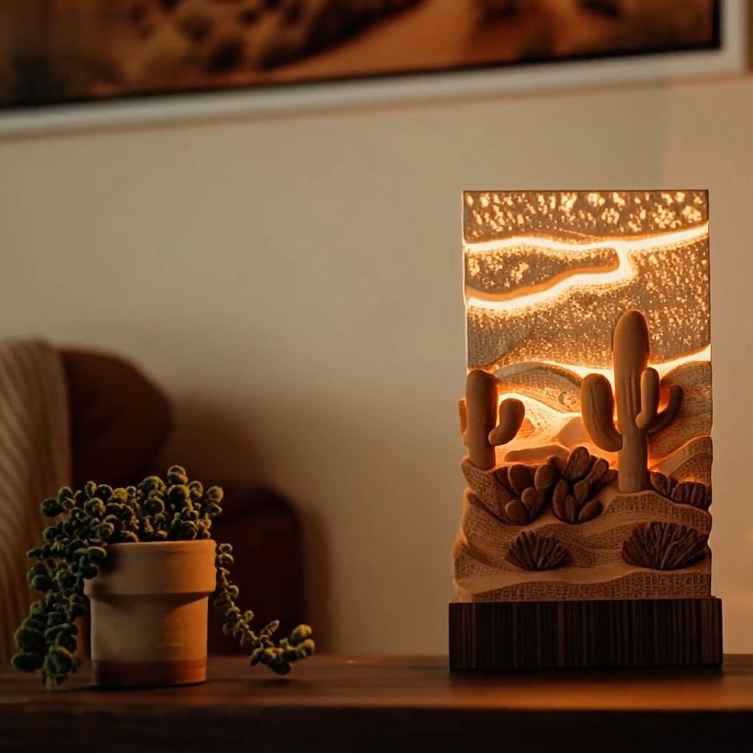 Transform your living space into a serene retreat with our Desert Cactus Aromatherapy Lamp. Expertly carved from sustainable wood, this piece captures the rugged beauty of a desert landscape, featuring detailed Saguaro cacti and rolling dunes. The layered relief design comes alive when illuminated, casting a soft, golden glow that mimics a peaceful Arizona sunset.