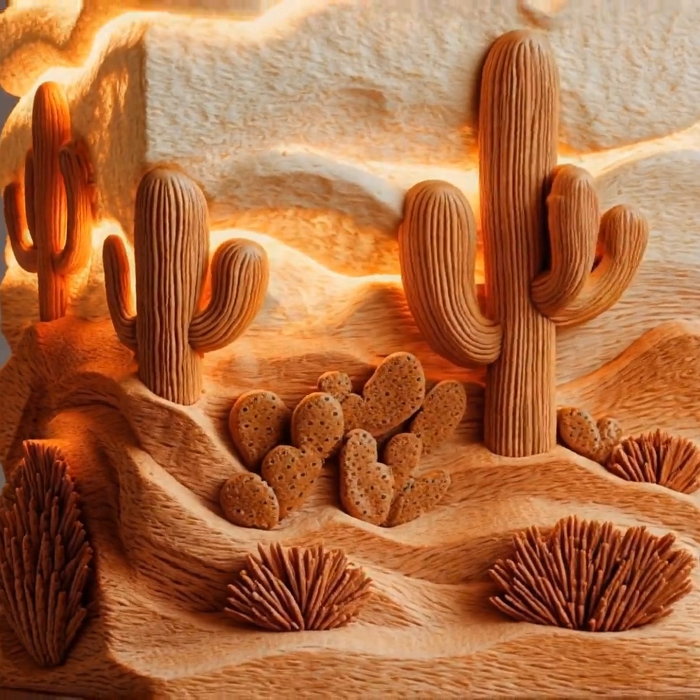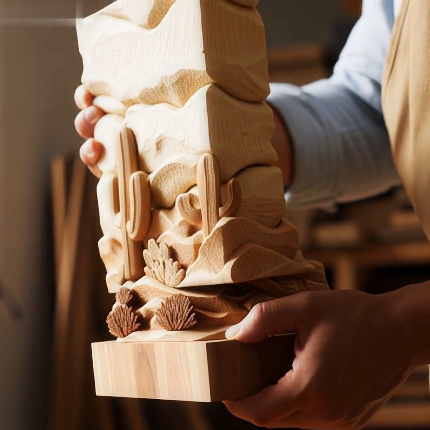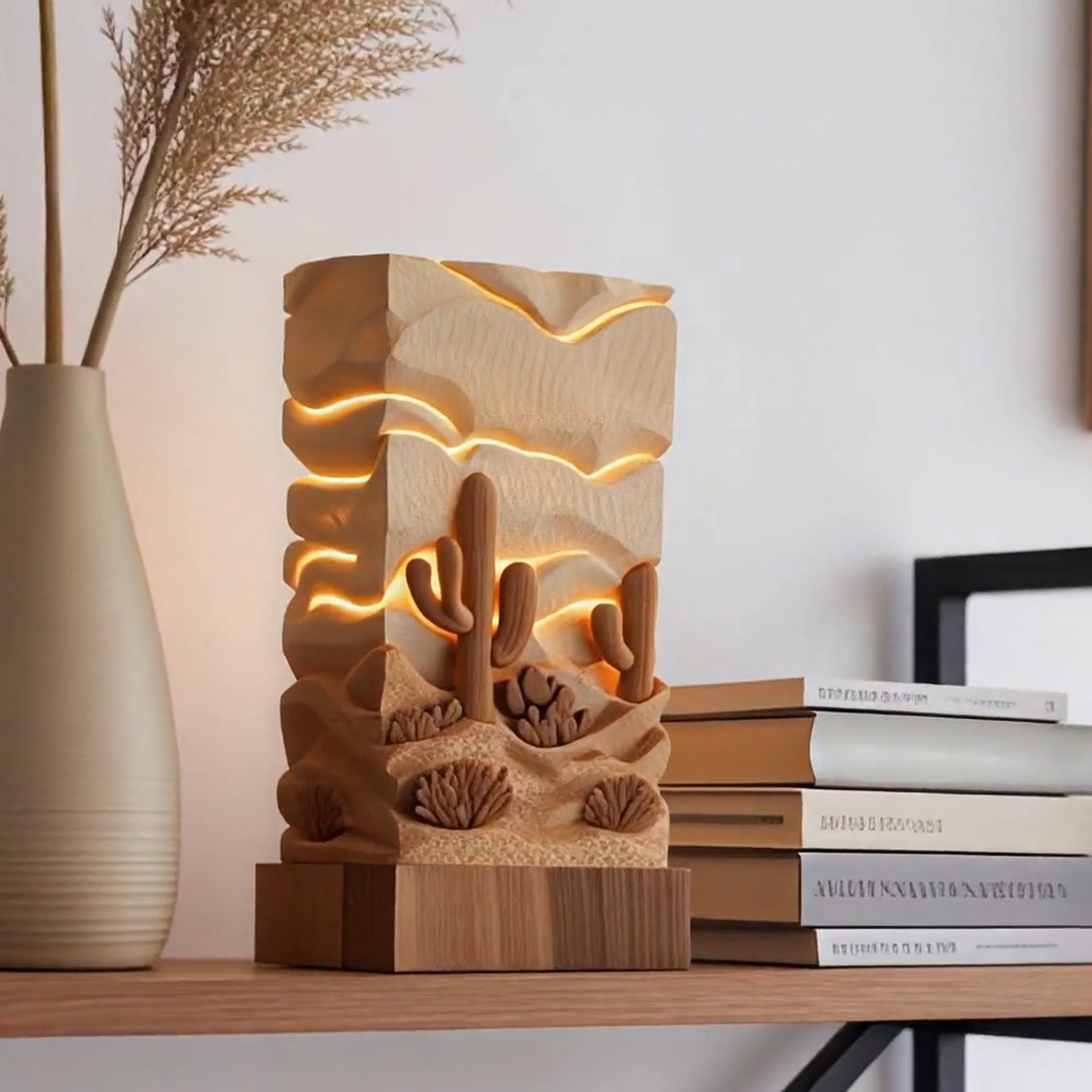 Transform your living space into a serene retreat with our Desert Cactus Aromatherapy Lamp. Expertly carved from sustainable wood, this piece captures the rugged beauty of a desert landscape, featuring detailed Saguaro cacti and rolling dunes. The layered relief design comes alive when illuminated, casting a soft, golden glow that mimics a peaceful Arizona sunset.